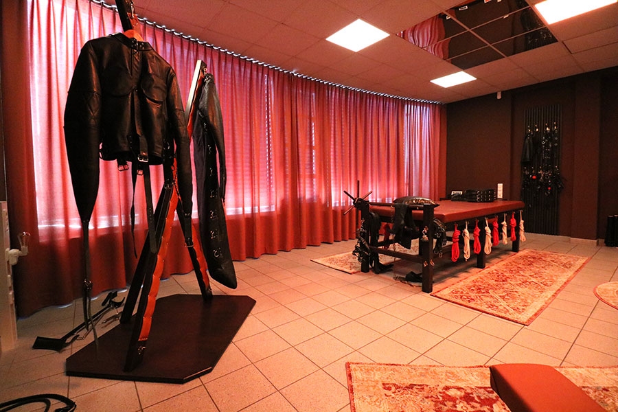 Das repräsentative stimmungsvolle 46 qm große Leder- und Bondage-Zimmer mit originellen Holz-Leder-Möbeln, wie große Streckbank, Strafbock und Andreaskreuz in warmen Lederfarben und echter Mid-Century-Design-Einrichtung lädt den Besucher auf eine bizarre Reise ein.